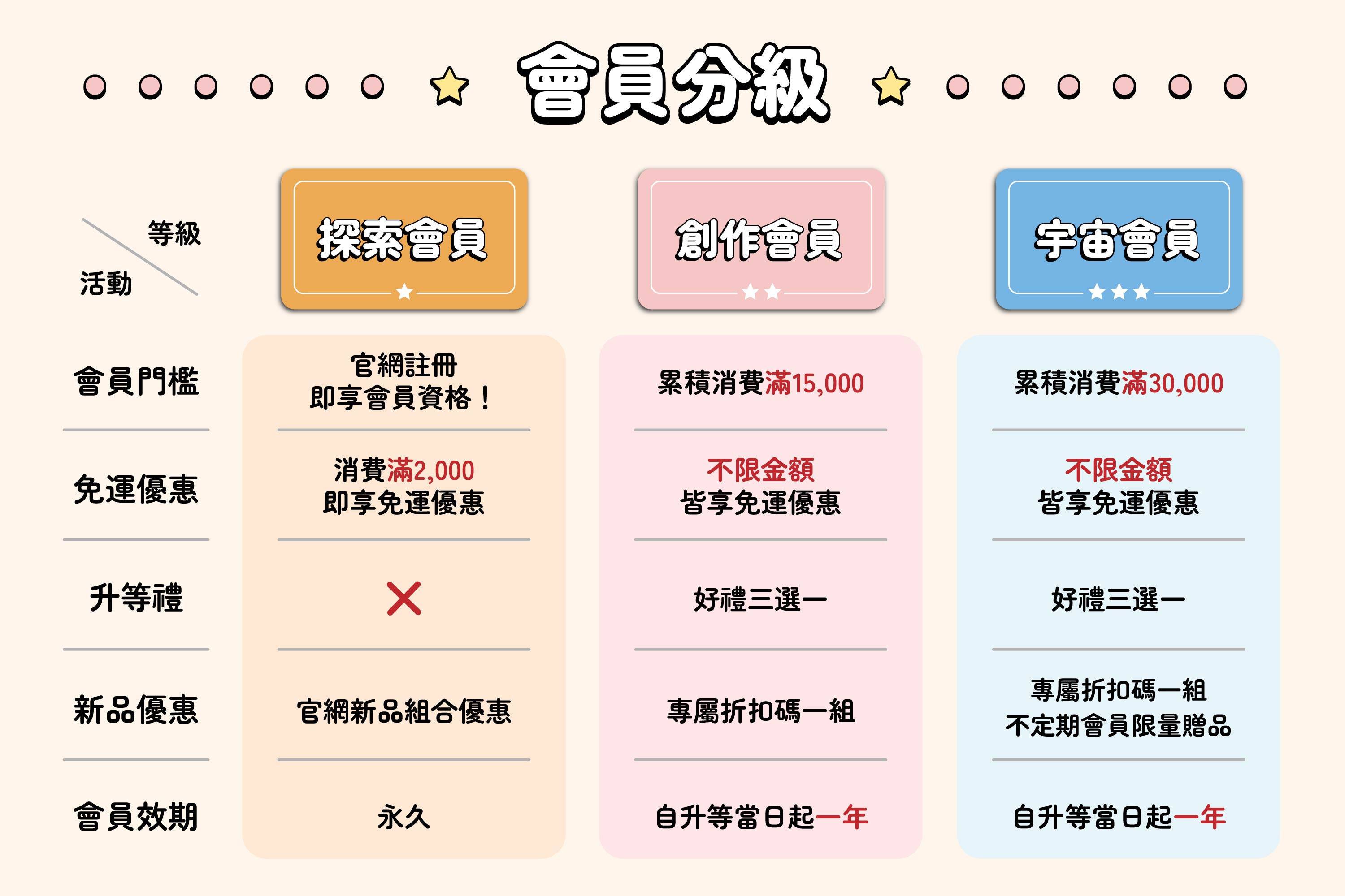 2. 創作會員與宇宙會員於會籍效期內,享有無次數限制的不限金額免運優惠(僅限台灣本島地區,離島或海外運費另計)。
